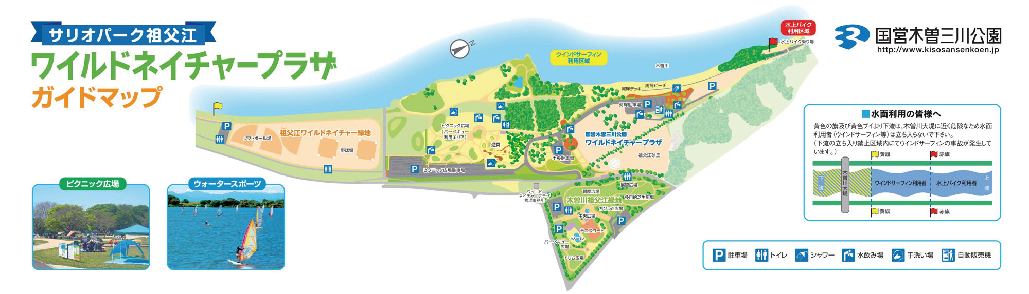 木曽川では、ウインドサーフィンなどが一年を通して楽しめます。河畔デッキの近くには野外シャワー、トイレがあります。 ★ウオータースポーツはルール・マナーを守って楽しみましょう!★ 詳しくはコチラ |