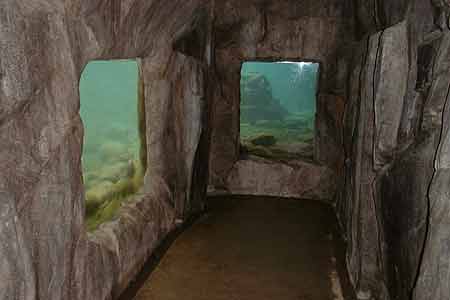 園路沿いの洞窟を下りると、向かって正面と左側にガラス窓がはめ込んであり、木曽川水園の水の中の様子を観察することができます。観察窓の大きさは、正面が縦1m×横0.8m、左側が縦1m×横1.3mあります。アユの群の泳ぐ姿など水辺の生物の姿をリアルタイムで観察することができます。